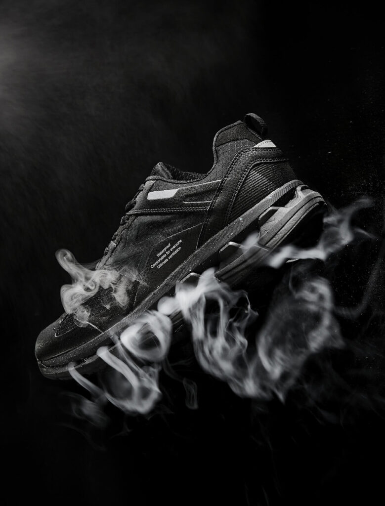 一般的な防水スニーカーに使用される“防水フィルム”は、どうしても靴内の湿気を閉じ込めてしまい、