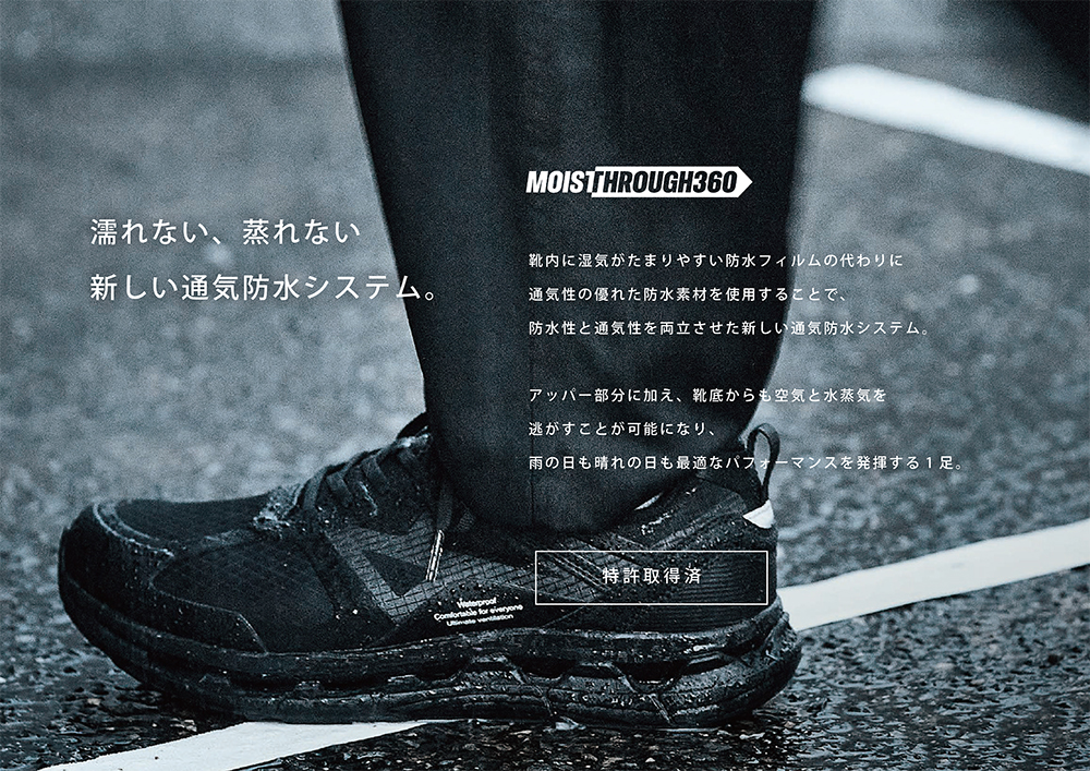 約70年の歴史を持つ日本の老舗シューズメーカーHIROSHIMA KASEIの技術力と、必然性から生まれたデザイン哲学【INEVITABILITY=DESIGN】が融合したMOISTHROUGH360。特許出願済みの全方位通気防水システムをはじめとする革新的な技術を搭載し、全天候下での快適性を妥協なく追求します。 それは、生活に、そして心と体にまで心地よさをもたらす必然の選択。MOISTHROUGH360は、あなたの足元から、より快適な毎日をサポートします。