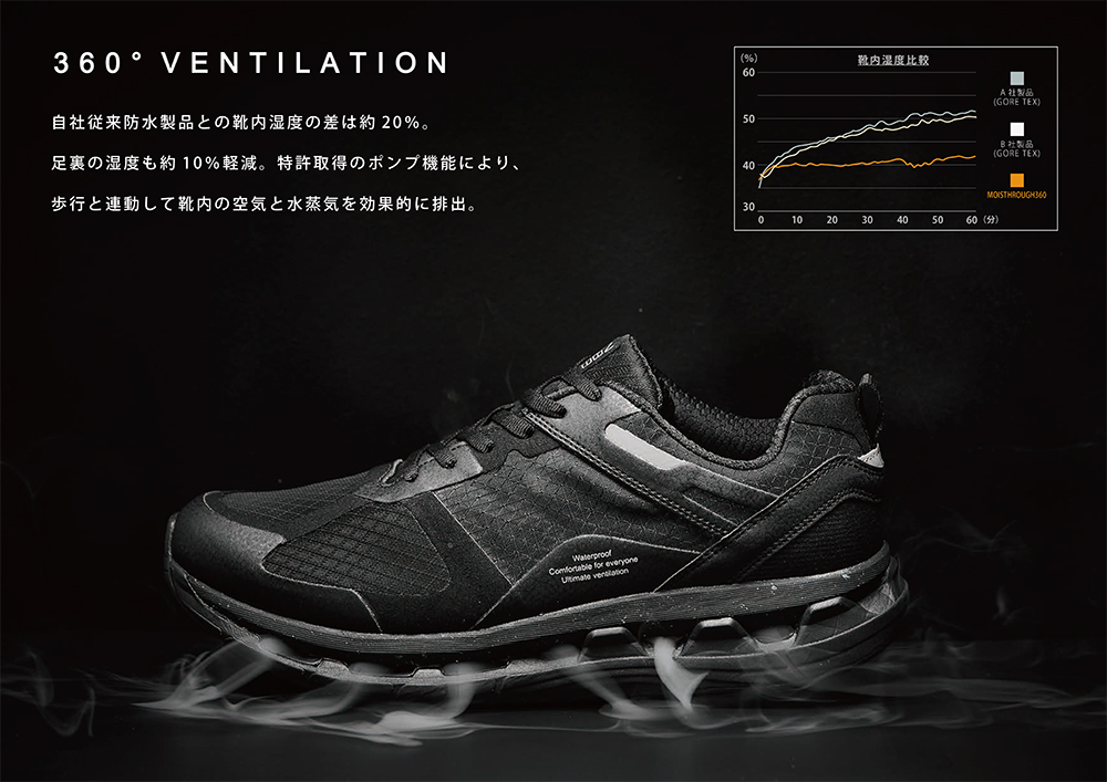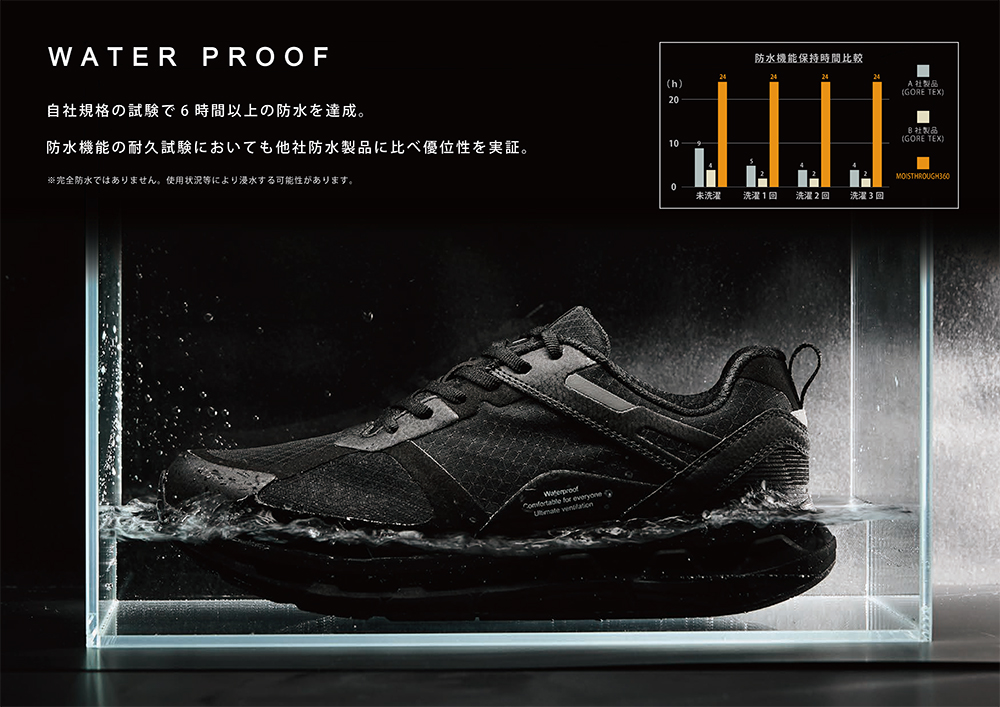 しかしMOISTHROUGH360(モイスルーサンロクマル)では、通気性に優れた防水素材を採用することで、防水性と通気性の両立に成功。