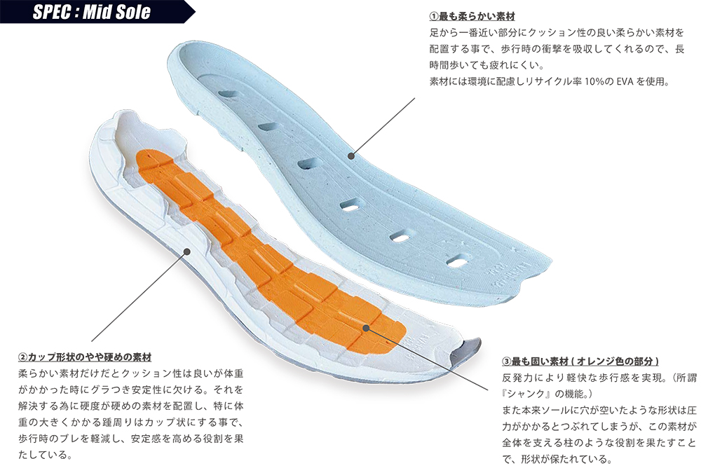 この3つの要素を軸に、まるで素足のような爽快感と、軽やかで高反発のソールが一歩ごとに“歩く楽しさ”を感じさせてくれます。